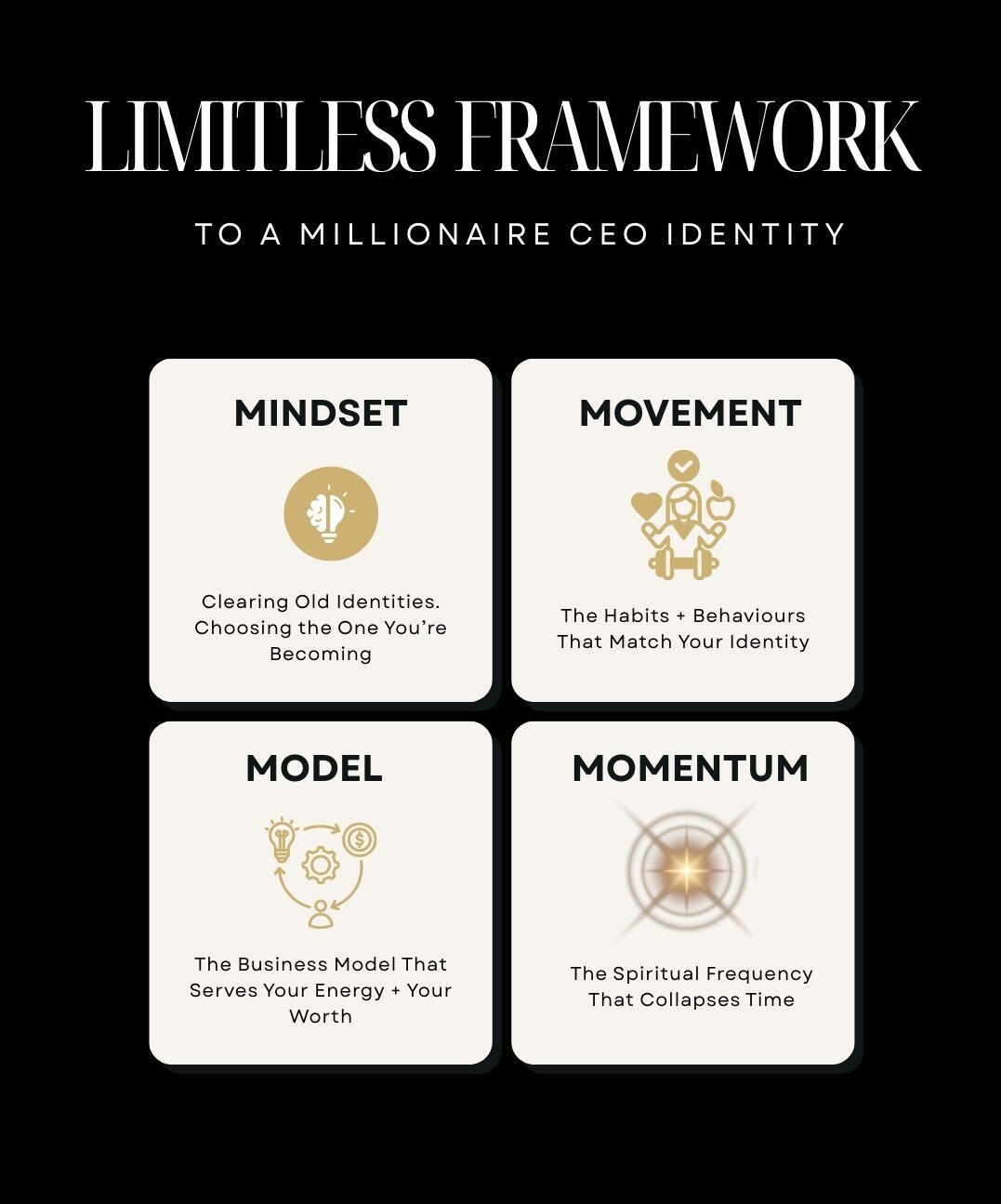 Your very own Limitless CEO Strategy booklet, designed to help you translate identity work into daily leadership. This is where your vision, values, habits, and decisions get anchored into a clear operating system. You’ll work through the Limitless Framework, the 3 D’s (Ditch, Delegate, Defer), energy and how you're spending it, and CEO level standards, so your days are led with intention, not reaction. This becomes your personal blueprint for how you think, move, and lead as the woman your next level demands.