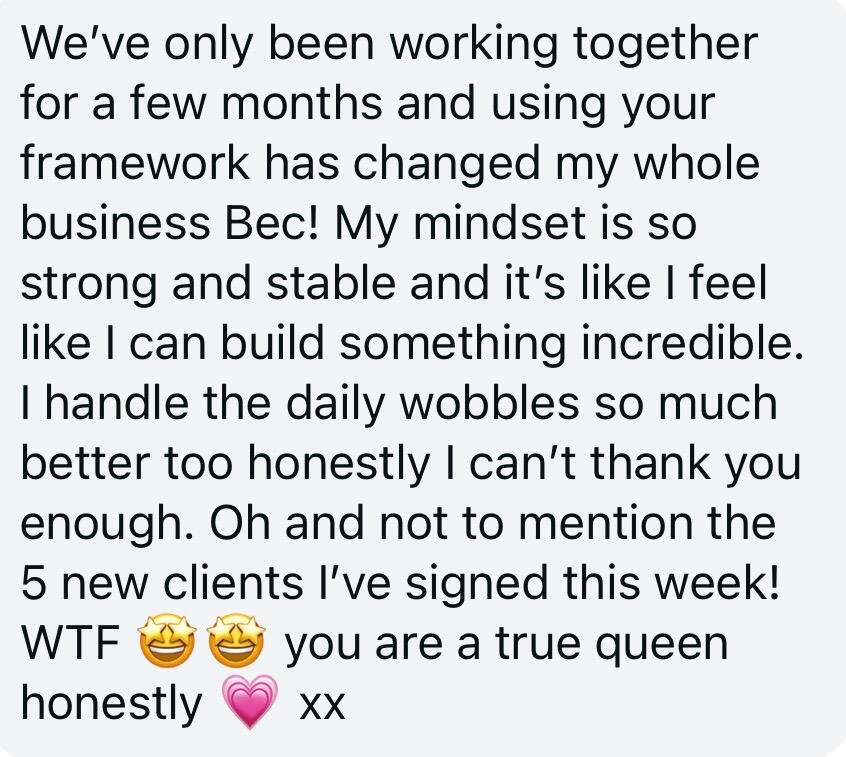 This is for you if:- You are an established female founder who’s already doing the work, already showing up, and already building something real... but knows your discipline and CEO habits need to be refined and dialled up.- You know your results are being shaped by how you think, decide, and lead, therefore something has to change.- You’re ready for a mentor to see your blindspots, because you want speed, not soothing.- You feel capable, yet frustrated because no matter what you do, you just can't seem to crack the next level.- You're clear on your message, and the type of brand you want to build but you know you need to refine and stabilise your foundations.- You feel the gap between where you are now and where you want to be but you don’t know how to plug the gap.- You keep hitting emotional ceilings such as experiencing overwhelm, frustration, or “why does this feel harder than it should?”, and you want it to feel easier.- You crave deeper inner stability - less reactivity, more grounded clarity and calm leadership.